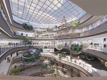 Японський торговий центр Fukaya Garden Outlets: із сталевою конструкцією з частковою двоповерховою конструкцією, зовнішні стіни будівлі представляють плісирований вигляд, як орігамі, що робить його виразною особливістю торгового центру. Його фуд -корт знаходиться на другому поверсі, що пропонує подвійний вид на торговий центр та далекі гори.
